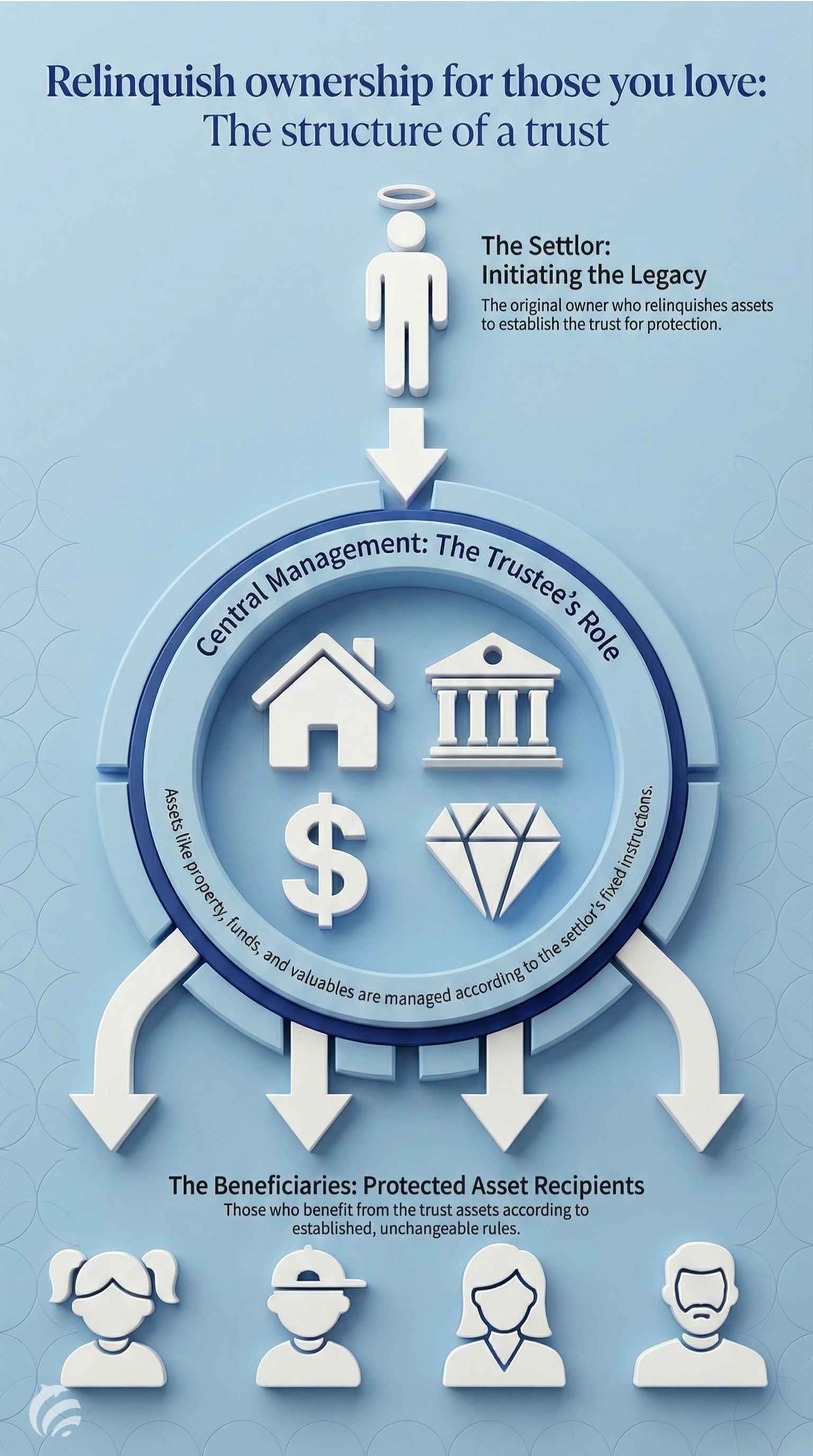 All in all, it consists of an agreement between the settlor and the trustee which will administer the assets as stipulated in the trust deed, in other words, as stipulated by the settlor. Simply speaking, nobody can take away what doesn't belong to you, yet those dividends, real estate, jewels, or cash will be distributed among those whom you choose.